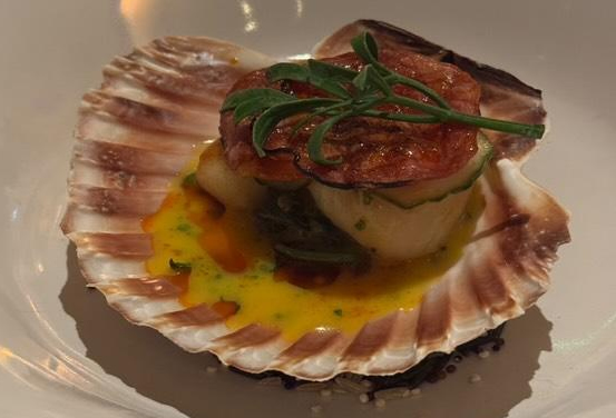 diver caught scallop with saffron beurre blanc, chorizo & sea herbs served in a scallop shell. The scallop was beautifully soft and the generous portion of beurre blanc velvety and rich.