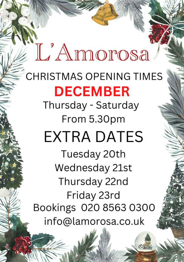 L'Amorosa has once again opened its doors, after a disastrous two years of opening and closing due to Covid, Major Flooding, and Staffing issues. Chef Andy Needham has finally been able to return to cook, with some amazing, cooked to order dishes, and regular specials. We look forward to seeing you soon. Chef and owner Andy Needham spent 15 years as Head Chef at the Michelin-starred Italian restaurant Zafferano in Belgravia before launching L’Amorosa in September 2014. Since then, the restaurant has been awarded the prestigious Michelin Bib Gourmand, which recognises high quality of cooking and value for money, for six consecutive years (2016, 2017, 2018, 2019, 2020, 2021), as well as OpenTable's Diner's Choice Award (2018) for Outstanding Food & Service and Hammersmith & Fulham’s Best New Business award in 2014, shortly after opening. To book call 020 8563 0300 or email info@lamorosa.co.uk.