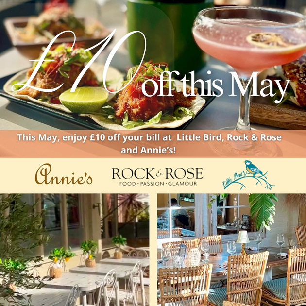 This May, enjoy £10 off your bill at Little Bird, Rock & Rose and Annie’s!