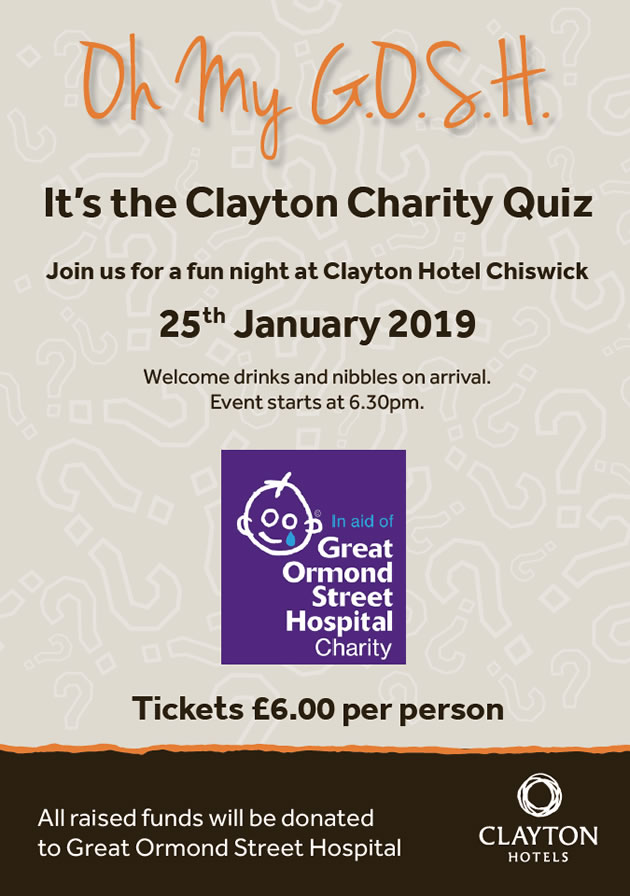 Every year Clayton Hotel Chiswick collect funds to support the Great Ormond Street Hospital Charity. In 2018 they managed to donate a generous amount of £5000 to the non-profit organisation and their goal is to increase this in 2019. Their next event is a fun quiz night on the 25 January 2019 at Clayton Hotel Chiswick. The event will begin at 18.30 with complimentary drinks and nibbles. Tickets are £6. They say, "Our team is fully dedicated for this great cause and they do their best to raise awareness and collect donations. As an example some of our team members have done a 70Km trek in the Pyrenees and others joined The Royal Parks Summer Run in Hyde Park. "Every contribution makes a difference and brings us closer to achieving our goal, hence all little donations are greatly appreciated. " Tickets are also available on the day and any time at the main hotel reception. Read more on Facebook and you can also get tickets on Eventbrite.
