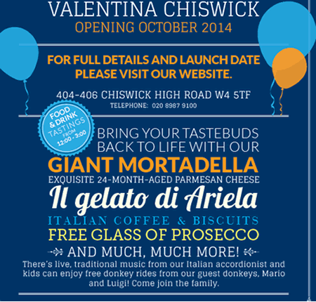 Valentina Fine Foods, the Italian delicatessan, restaurant,, wine and gift shop will open in Chiswick on Saturday, October 4th, at 404-406 Chiswick High Road. The restaurant, the seventh in the family-run chain, will have a Grand Opening Event from 12 to 3 with free food and drink tastings, donkey rides for the children, and live music. (See poster below) "Valentina Fine Foods openings are always an event for all the family. Expect to see donkey rides for the kids, live music, photo ops with a vintage Fiat car, goody bags to give away and complimentary drinks and food." says the website. The new Valentina Chiswick ( the name is shared with the daughter of one of the founding families), restaurant/deli/shop is located opposite Turnham Green, in the premises formerly occupied by Villagio. Valentina has six branches in London, Surrey and Kent- until now the nearest branches have been East Sheen or Putney. You can watch the story about the family on this video by Chiswick-based company Ocicat in which founder Bruno Zoccola describes how his parents emigrated from Sant'Elia Fiumerapido, a small village near Monte Cassino southeast of Rome, arriving in London in 1958.