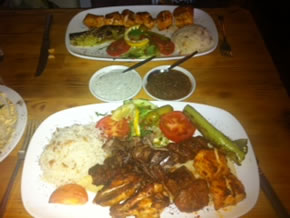 We opted for the Tavuk Sish ( marinaded chicken cubes) and the Karisik Izgara which consisted of lamb, chicken and kofte. Main courses are served with salad, rice, or couscous. The chicken was plentiful, succulent and tender. It was served with a mound of white rice, mixed with a little brown rice for texture, a salad garnish, tomato and pickles. The mixed platter was a carnivore’s delight, an enormous mound of meat, each giving a different flavour and texture. The lamb was moist and tender, the kofte delicately spiced. A green chilli sauce and a yoghurt and mint sauce were also served alongside. I had two glasses of the house white wine to accompany my main course and we also asked for sparkling water. There are several vegetarian options including aubergine dishes or fish and apart from grilled meats the menu includes choices including turkish-styled lamb or chicken casseroles as well as fish. As we tucked in the restaurant began to get busy with the arrival of a number of family groups who all seemed to be regulars. The early evening solo diners had by then folded their newspapers up and left.