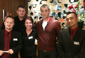 Currently in London filming a new comedy about a comedy Episodes, former Friends star Matt Le Blanc dropped into the Chiswick Moran Hotel and was happy to be photographed with members of staff. Le Blanc's latest role sees him playing a parody of himself and is humiliated when he is asked to audition to play 'Matt LeBlanc' in a new programme.