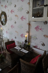 One of my favourite childhood memories was being allowed to hold the fish and chips on the way home from the chip shop. Even though the paper package would scald my legs, the victory of being the ‘chosen one’ (I’m one of five and this was a major battle to win!) and that indescribable aroma would make the discomfort worthwhile. But that was back in the days when we would eat them straight from the paper with little wooden forks, make doorstep chip sandwiches with white bread and lashings of butter in blissful ignorance of cholesterol, drink litres of Panda Pops whilst listening to football results on the radio. It did us no harm! These days I get the sense that simple fish and chips are no longer good enough, they need to be ‘traditional with a twist’, fried in special batter or particular oil with twice cooked chips etc. And even when I do manage to find somewhere that doesn’t chef around too much with the fish or spuds, for some reason it never tastes quite as good as I remember it did as a child. Back to present day and onto to Chiswick’s latest fish restaurant Reef. Launched by Lorraine Angliss whose two branches of Annie’s in Strand on the Green and Barnes and the new Rock and Rose in Richmond all enjoy great success and have earned a loyal following (and I would go so far as to say that the fish and chips at Annie’s is rather good if you’re not trying to equal a memory). Reef is Lorraine’s latest venture for which she “upped the glamour stakes on traditional fish and chips” and locals have great hopes that her boutique fish and chip restaurant will succeed where others have failed following the long-lamented departure of Christian’s. The décor of the diminutive Burlington Road site is typically Annie’s, sumptuously intimate with candelabras, cushions, chandeliers and Nina Campbell designed wall coverings. Not an inch of space has been wasted with the main dining area being proficiently filled with her trade mark wooden tables and whicker chairs and further tables positioned in the slender corridor.