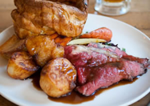 So how did it taste? For an animal with a reputation as coarse as a goat the flesh was marvellously tender, not overly smoked and set off perfectly by the tangy chilli salsa. The aftertaste lingered a little too long into the main course, but that is always a danger when you choose a spicy started ahead of a traditional roast. My chosen starter was potted shrimp in smoked butter. I think I would prefer slightly less butter and more shrimp- I couldn't define any smoked flavour at all. I was keen to try the Roasted Rare Breed beef, as did my son and daughter. Husband opted for the Pork rib eye & smoked shoulder. Another tempting offering was a smoked Elwy Valley lamb shoulder, but that might be for another day. For non-meat eaters, there was a fish offering and and a blackened Butternut squash served with tahini and flatbread.