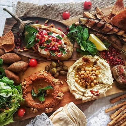 Lebanese food favours spices such as za'atar and sumac with herbs such as mint, lemon and parsley. Kibbeh (minced lamb with bulghur wheat), hummous, tahini, pomegranate and orange blossom water are common , and the meal usually consists of hot/cold mezze starters followed by meat, fish, or vegetarian. Typical main dishes are combinations of rice with meat, vegetables, and salads. Desserts are generally fresh fruit, or pastries often called 'sweets' or baklawa.