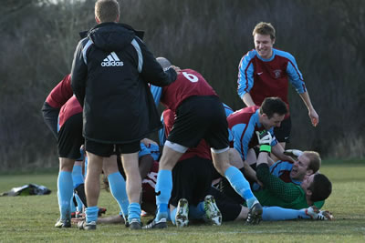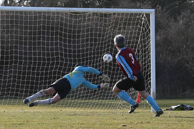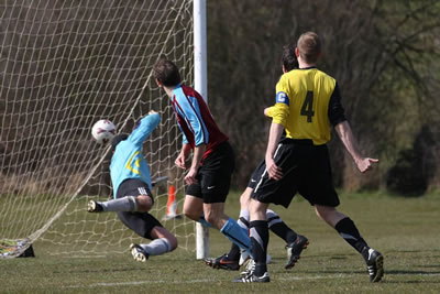 Ten minutes later Meads were two up as Aidan Chapman's long throw was touched on for Costello to notch his second with a crisp volley. Hamptonians now stepped in to take up the slack left as Meads took their foot off the pedal. Almost immediately keeper Garry Robinson was called on to demonstrate his fine spell of form with a save at full stretch at the post but with just five minutes to go before half time OH's got their just reward when Craig Ashby volleyed in a corner from the edge of the area. On the restart Hamptonians carried on where they'd left off and Meads were hanging on while biding their time before injecting stiffening and flexibility to mid-field, bringing on Ryan Bright and Germaine Queensborough and injecting pace up front with Matt Allen.