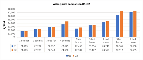 Demand Last year, we reported that properties were letting within the first few days of coming onto market; this urgency among tenants has cooled slightly and in Q2 of this year, we recorded an average period of 13.3 days for flats and 10.9 days for houses from the day of launch to securing a tenant. That said, the volume of enquiries is only marginally down – 1.9% and 2.7% respectively – when comparing to the same period in 2022, and our number of lets in Q2 is coincidentally unchanged year-on-year. With the increase in stock in the flat market, tenants are approaching viewings with less pressure to offer, whereas it is clear that the low volumes of houses coming available has led to faster lets as the demand for these remains unaltered. Values Rents are continuing to rise and our records are showing they have risen on average by a further 5-10% on last year, bringing the increase on the pre-pandemic averages to 25-30% (or more!). The average one-bedroom flat now achieves £1763pcm in comparison to £1408pcm in 2019, and the larger family homes can now command £7500pcm, an increase of £1750pcm in the last four years.