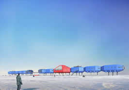 Chiswick resident, Hugh Broughton, and his consortium have won an international competition to build a new ice station in Antarctica. Designed to cope with one of the most inhospitable environments on Earth, the proposed structure will resemble a giant blue centipede. British Antarctic Survey's Halley VI station will not only be on a floating ice shelf that will flow out to sea and break up, but it will host scientists all year long in temperatures that range from minus 5 degrees to minus 40 degrees Centigrade (23 degrees to minus 40 degrees Fahrenheit). The winning design, by the Faber Maunsell and Hugh Broughton Architects consortium, consists of a long, segmented body held high off the ground by adjustable legs on skis so it can be periodically towed back towards land. It beat off designs from two other finalists, one of which was for a "walking" building and the other for a building that appeared to hover on legs above the ice. "This was an incredibly tough choice for the jury panel to make," BAS director Chris Rapley told Reuters "The process ... was stimulating and exciting for everyone involved." The design specifications for the £19 million ($33 million) ice station on the Brunt ice shelf are among the most exacting on the planet. It must it be home to a crew of scientists that dwindles to 16 in the southern hemisphere winter when there is no daylight for three months and booms to 60 in the summer months, and it has to rise above the 1.5 metres of snow that falls each year. At the same time every nut and bolt must be shipped in and, when the station comes to the end of its anticipated 20-year life, everything must be shipped out again to leave no trace of its existence on the pristine continent. Four of the previous Halley ice stations dating back to the 1950s have slowly been buried by the snow and crushed by the ice as it travels northwest at the rate of 400 metres a year and gradually breaks up at its seaward edge. The Halley V station it will replace by December 2008 also has adjustable legs and is the only one not to have been buried. However, it faces another problem. Scientists predict that the ice shelf will halve within the next decade and the section of ice on which Halley V sits will simply float away. The new, towable ice station should be able to avoid such problems by simply moving out of the danger area, allowing scientists to carry on vital research at the site where the hole in the ozone layer was first discovered. During an interview for BBC's Today programme Hugh Broughton explained that a two storey climbing wall is planned to keep the resident scientists fit and entertained. The structure also has the capability to grow salads hydroponically, providing nutrious salads up to 3 times a week.