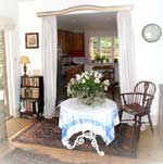 kitchen has white marble surfaces and old pine cupboards, a tiled