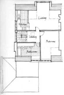 be re-converted, has a tiled kitchen at one end, dormer windows