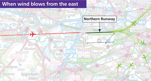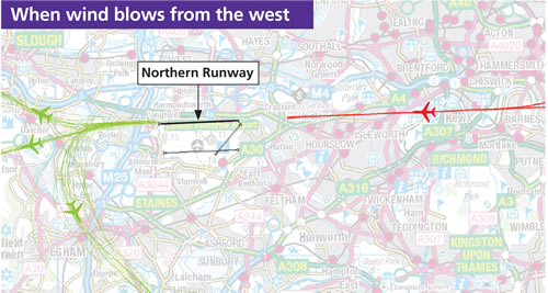 Arriving aircraft fly in from the direction of London (red line) Departing aircraft take off towards the west (green lines) Cranford, Hounslow West, Syon, Kew, Chiswick, Barnes and Fulham 2. when wind blows from the east
