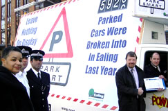 Public awareness is key to Ealing Council and Ealing Police's joint blitz on vehicle crime. The campaign continues this week with a five week tour, starting Monday 1st March, of the borough by the Park Smart mobile billboard. The message is clear, and emblazoned across the twenty foot 'poster on wheels': don't leave valuables on display in your car. Last year in Ealing 5,925 cars were broken into in order to steal objects that were in view. In partnership with Ealing Police, the council's community safety team has organised the poster tour as part of the Park Smart initiative which began last November to alert residents to this issue. Later in the year posters will be displayed on the backs of buses, and at other sites around the borough. Councillor Shital Manro, cabinet member for community cohesion, thinks the campaign is a great idea, "We can all become careless from time to time and leave things on the dashboard or back seat of our car. This campaign will remind people that taking a few seconds to cover up their valuables, or take them with them, may save them from being the next victim of vehicle crime." Borough Commander Martin Bridger of Ealing Borough Police believes the public has a key part to play in crime prevention, "This latest partnership initiative outlines our joint commitment to reducing motor vehicle crime in Ealing Borough. However the public have a role to play too and that is what this campaign is about. Our crime preventative message is simple: keep valuables out of sight whenever you leave your vehicle. The public can also reduce the risk of becoming a victim by making use of secure car parks on the borough or parking in well-lit or residential areas. Remember motor vehicle offenders tend to be opportunistic - don't make yourself an easy target." The campaign will be funded by an award of £15,000 made to the council by the Government Office for London specifically to combat vehicle crime.