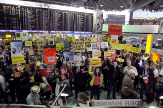 The night ban at Frankfurt is only one of the demands of the German protesters, thousands of whom occupy the airport terminal every Monday night (pictured above, courtesy Lärmfurt). They are objecting about the impact of the 4th runway which was opened in October. The night flight ban will apply to all the airport’s runways.