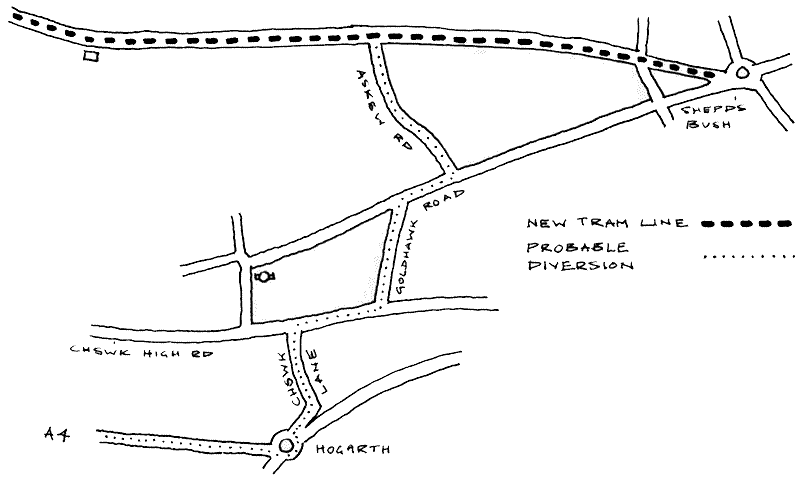 The recent revelation that Transport for London was planning to divert all traffic travelling westbound down the Askew Road 'in the direction of the A4' has caused a huge amount of uncertainty about proposals for a West London Tram. With the consultation close to a conclusion it remains unclear whether there are any plans to notify residents of this alteration to the scheme as presented in the original consultation documentation. The sketch map below shows the likely route that traffic will have to follow. Residents are already labelling it the Acton By-pass. Probable route of 'Acton By-pass'