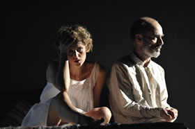 Denise Gough (Abbie Putnam) and Finbar Lynch (Ephram Cabot) Pictures by Keith Pattison They are called to supper by their younger half-brother Eben (Morgan Watkins), a desperately sad and love-starved young man who still misses his dead mum. Later, their father Ephraim Cabot (Finbar Lynch) turns up with his attractive younger wife Abbie (Denise Gough) and the action takes off towards its tragic, heart-stopping end. Gough is particularly moving as the passionate Abbie seeking to make the most her last chance of love and security. Lynch fulfils O’Neill’s description of Cabot as being like a ‘old bare hickory tree fit only fur burnin', who is ‘growing ripe on the bough’ (there are many repeated phrases like this which adds a poetic dimension to the otherwise colloquial language). The third side of the triangle, Eben, is a difficult character to play because of his mood swings as he is carried along in the wake of the emotional forces around him, but Watkins does it movingly, particularly in his brief period of blissful blossoming.