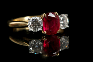 Lot 239. A Tiffany & Co., 18ct gold, ruby and diamond, three stone ring. Estimate: £2,000 - £3,000