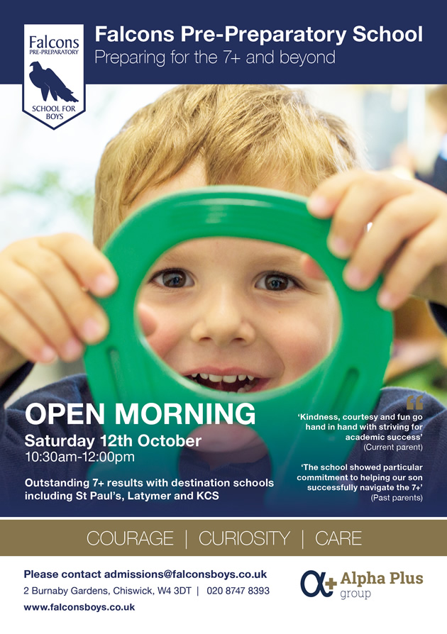 The Falcons Pre-Preparatory School in Chiswick is opening its doors to prospective parents on Saturday 12th October from 10.30am to 12.00pm. The new Head, Liz McLaughlin, will be talking to parents at 10.45am and staff will be on hand throughout the morning to conduct tours of the school and its facilities and to answer any questions Courage, Curiosity and Care underpin everything that we do at the Falcons Pre-Prep, both inside and outside the classroom, values which provide the boys with a wonderfully nurturing and happy environment where their learning takes place in many different ways. In addition to the core curriculum staff, we have specialist French, Art, Music and PE teachers, weekly Forest School sessions for Nursery, as well as a dedicated on-site catering team that recently won an award for their outstanding school lunches! We also offer Breakfast Club from 7.45am, late care until 6pm and a morning bus service. It would be helpful if you could contact our Registrar to confirm your attendance either via our website: https://www.falconsboys.co.uk/admissions/open-days or by calling the school on 020 8747 8393. We look forward to meeting you and showing you how we can give your son a flying start to his learning journey!