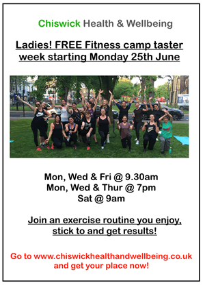 If you are a lady living in or around Chiswick, and want to get back into a regular exercise routine you enjoy so you shape up and get fit for the summer (without having to go to the gym), then taster week is perfect for you. Come down, try out as many sessions as you like (2 -3 recommended), and learn about how the fitness camp can help you get to your health, body and fitness goals as well as becoming an all round positive impact on your life. Simply go to www.chiswickhealthandwellbeing.co.uk and enter your name and email. I will send you your invite straight away. Any questions feel free to email me at dan@chiswickhealthandwellbeing.co.uk or call me on 07868148536. I hope to see you at taster week and help you get motivated back into regular exercise and making positive changes with your food and lifestyle. Dan :)