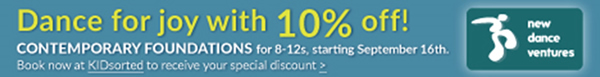 The Contemporary Foundation Course delivers an introduction to the technique, alongside creative & collaborative tasks designed to incorporate these movement themes. Dancers choreograph short pieces performed at the end of class. Founder and Artistic Director, Kate Scott passionately believes in offering dance instruction that promotes self expression as well as building strong-er bodies, co-ordination and self esteem. “I have seen the young dancers grow in confidence through discovering this unique and wonderful dance style…They become empowered, devel-oping a natural, signature dance style that is truly their own. Individuality can remain unprovoked by trying to achieve an overarching aesthetic;. Contemporary is free flowing and dynamic, using the whole body through space, there is no right or wrong!” NDV’s youth company, Youth Dance Ventures, will be showcasing their first choreographic work in a December showcase alongside the dancers from the Contemporary Foundation Course. Free trial/ £10 per class or book through KIDSSorted to receive a further 10% off a class when signing up for the whole course. Advertisement September 24, 2015 |