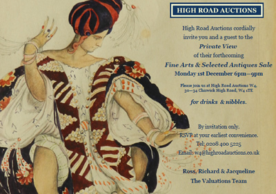 High Road Auctions invites you & a guest to the Private View of their forthcoming Fine Arts & Selected Antiques Sale Please join us at High Road Auctions W4, 30—34 Chiswick High Road, W4 1TE for drinks & nibbles. We would like to remind you that this is a guest list only event so please RSVP at your earliest convenience. Tel: 0208 400 5225 We look forward to seeing you then! Kind regards, Ross, Richard & Jacqueline, The Valuations Team