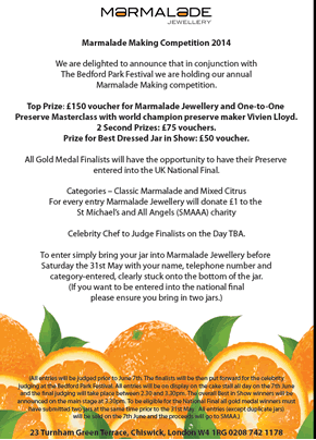 The annual Marmalade Making Competition 2014 is almost upon us. Held in conjunction with the Bedford Park Festival, the popular competition is sponsored by award-winning Marmalade Jewellery of Turnham Green Terrace. Top prize this year is a £150 voucher for Marmalade Jewellery and a one-to-one Preserve Masterclass with world champion preserve-maker Vivien Lloyd. A celebrity chef will judge the finalists on the day. There are two second prizes of £75 vouchers and a £50 voucher for the Best Dressed Jar in show. To enter simply bring your jar of home-made marmalade into the jewellery store by May 31st with your name, phone number and category labelled and stuck on the bottom of the jar. The categories are: Classic Marmalade and Mixed Citrus. All Gold Medal finallists will have the opportunity to be entered into the UK National Final - if you want to ensure you are entered into the National Final, please bring two jars. For every entry, Marmalade will donate £1 to the St Michael and All Angels ( SMAA) charity.