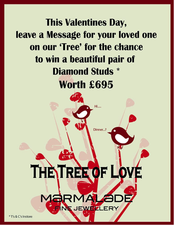 This Valentine's Day leave a message on the Marmalade 'Tree' for the chance to win a beautiful pair of Diamond Studs * * T & C's instore.