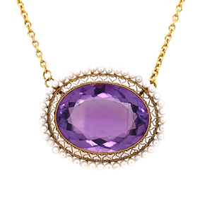 A striking vintage pendant featuring a large Amethyst. This beautiful yellow gold pendant is inspired by popular Victorian Amethyst and Pearl brooches. The faceted Amethyst measures approximately 23x17mm, approximately 20ct, surrounded by delicate gold lattice work and a halo of Freshwater Pearls. The luscious deep purple colour of this Amethyst which makes it such an alluring pendant!