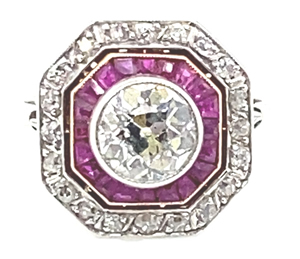 A stunning Art deco ring featuring a central old cut diamond in a rubover style setting. This charming antique ring is known as a ‘target ring’. Target rings were first created in the Edwardian era (typically they were round in shape reflecting the bullseye from cupid’s bow and arrow), as a symbol of everlasting love with the round double halos creating sparkle and colour. This ring dates slightly later, drawing influence from the geometric shapes favoured in the Art Deco period. The Rubies were chosen to represent love and each one is hand cut to fit perfectly around the diamond.