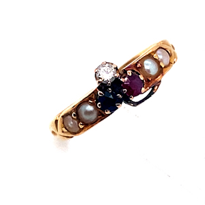 A sweet Victorian ring featuring Diamond, sapphire, Ruby and Pearls. The ring is hallmarked by the Chester Assay office and dated to 1892. It’s dainty gem-set clover leaf design is so charming and maybe it was offered once as a token of affection and luck.