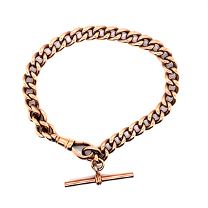 A classic antique watch chain converted into a bracelet. This beautiful handmade 9ct gold chain features the original albert clasp and hallmarks on each link. The bracelet has a lovely rose tone to the gold and heavyweight feel (25.5g). Originally watch chains were used to hold gentleman’s pocket watches in their waistcoats (think Peaky Blinders!). Circa 1920.